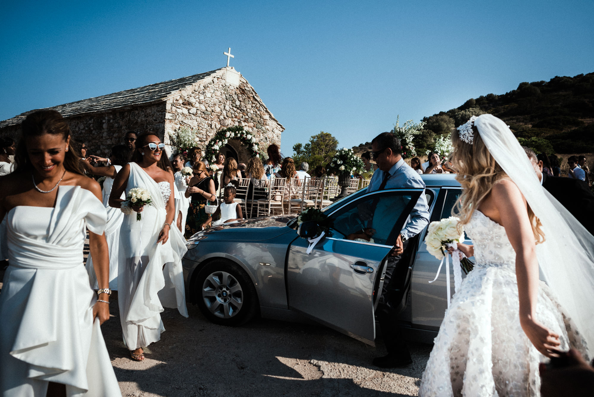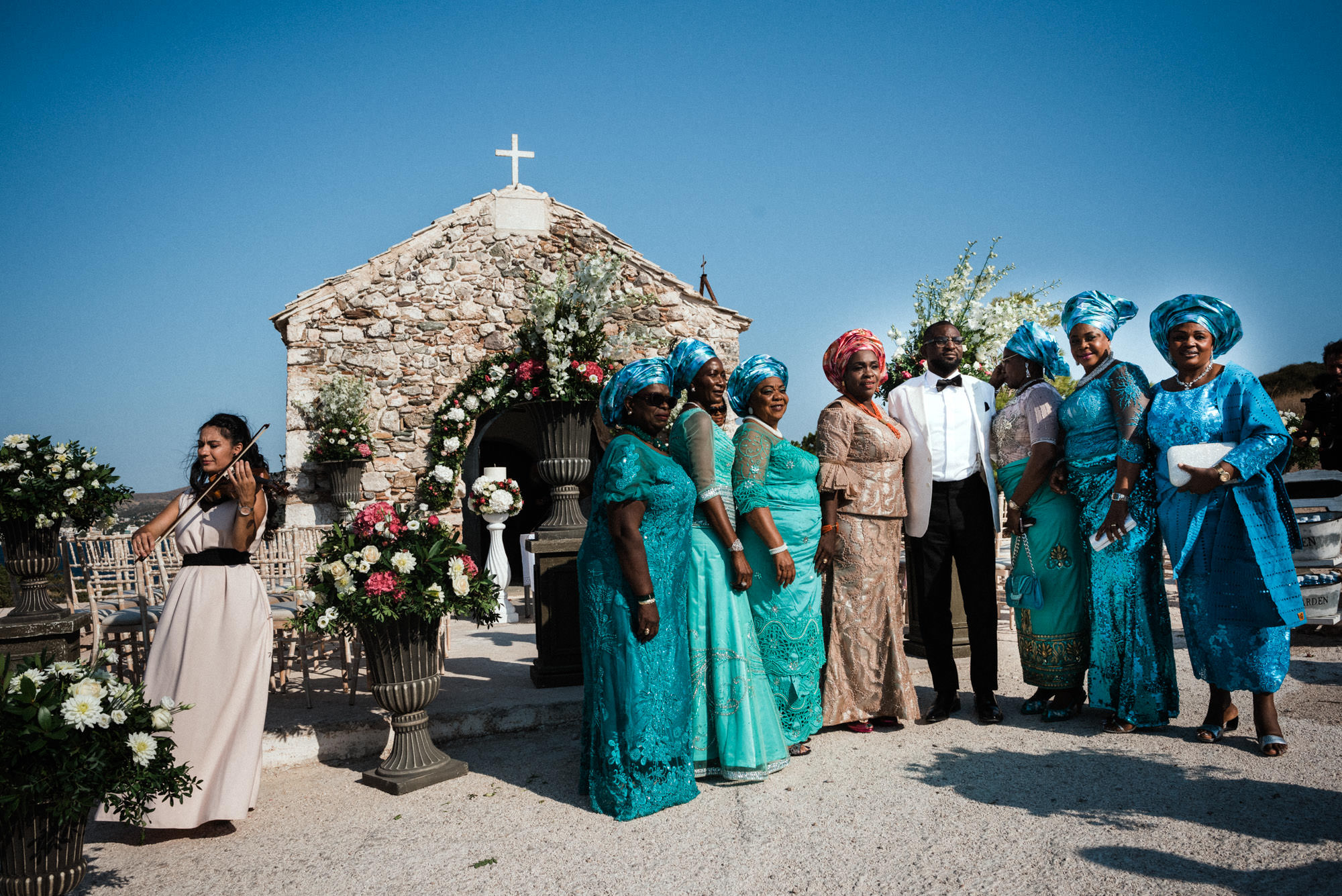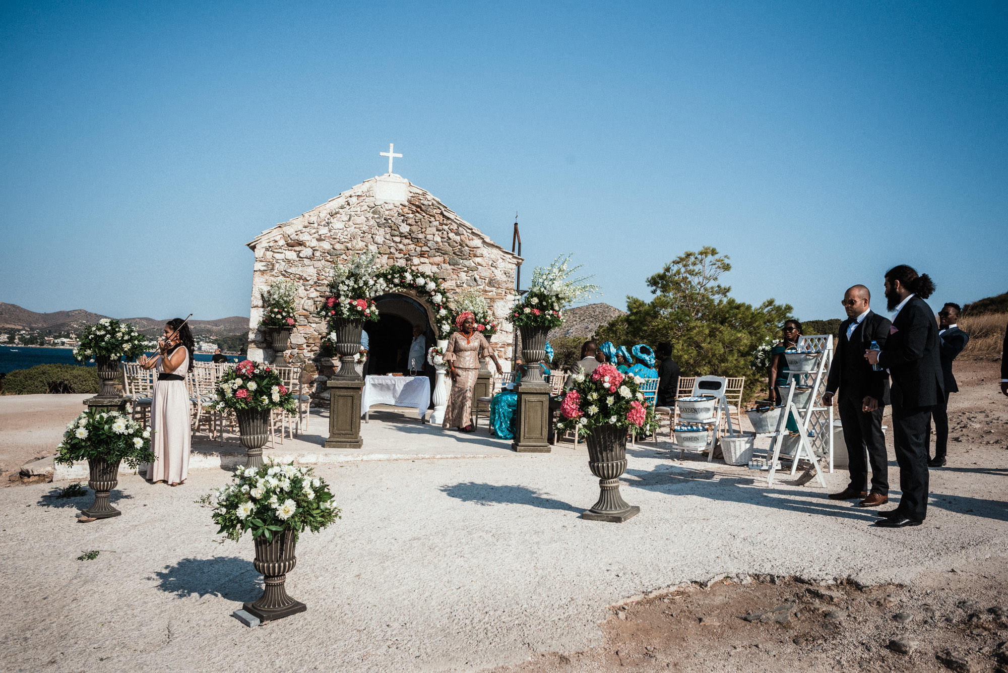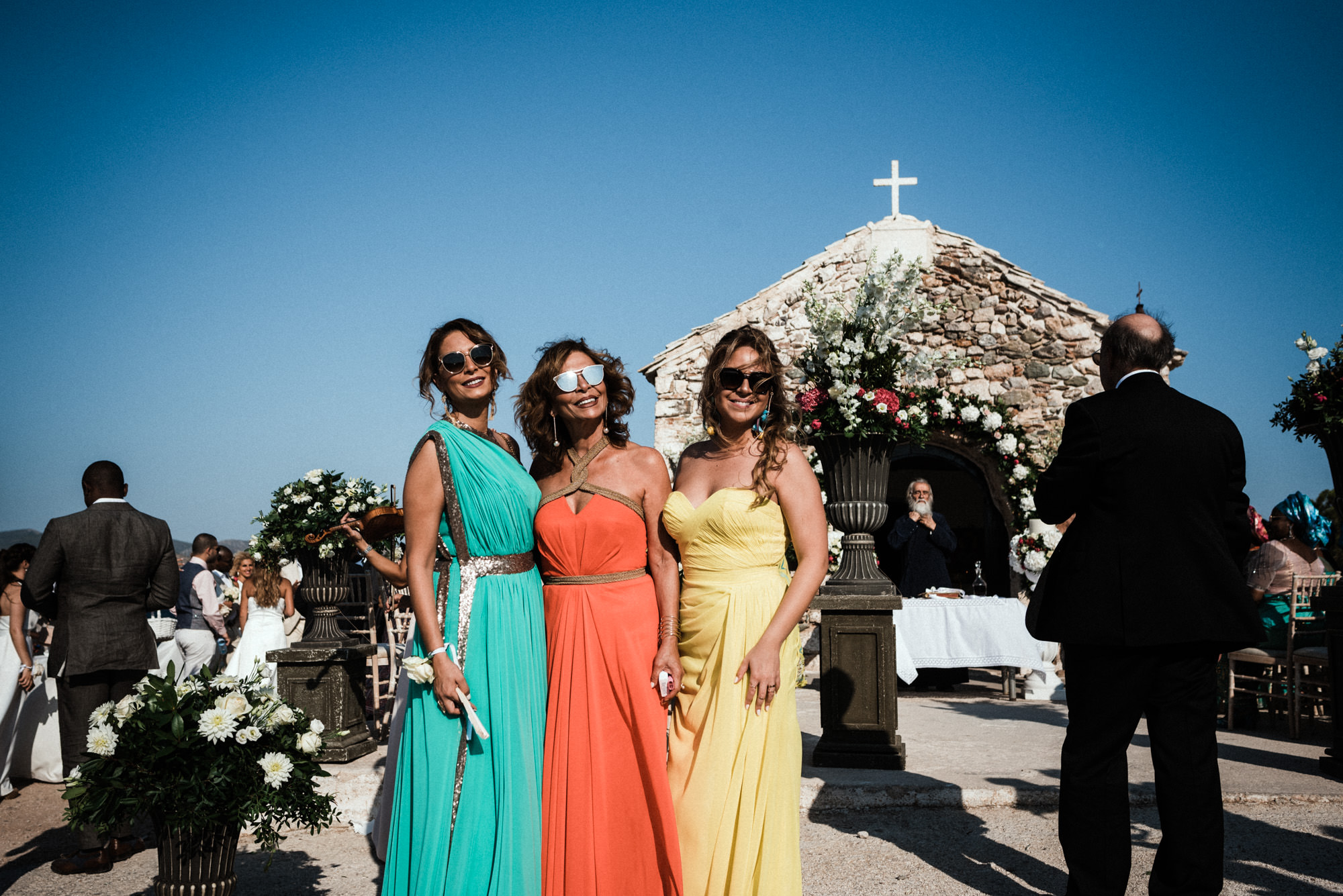 The afternoon Athenian Riviera Orthodox church service in Anavyssos, complemented perfectly the beautiful, colourful dresses of the wedding party. Just perfect. You could just feel the raw emotion, and the love in the air as soon as Hala stepped out of the car, to be escorted by her father to the small stone church where Michael, and his family and friends were waiting.
