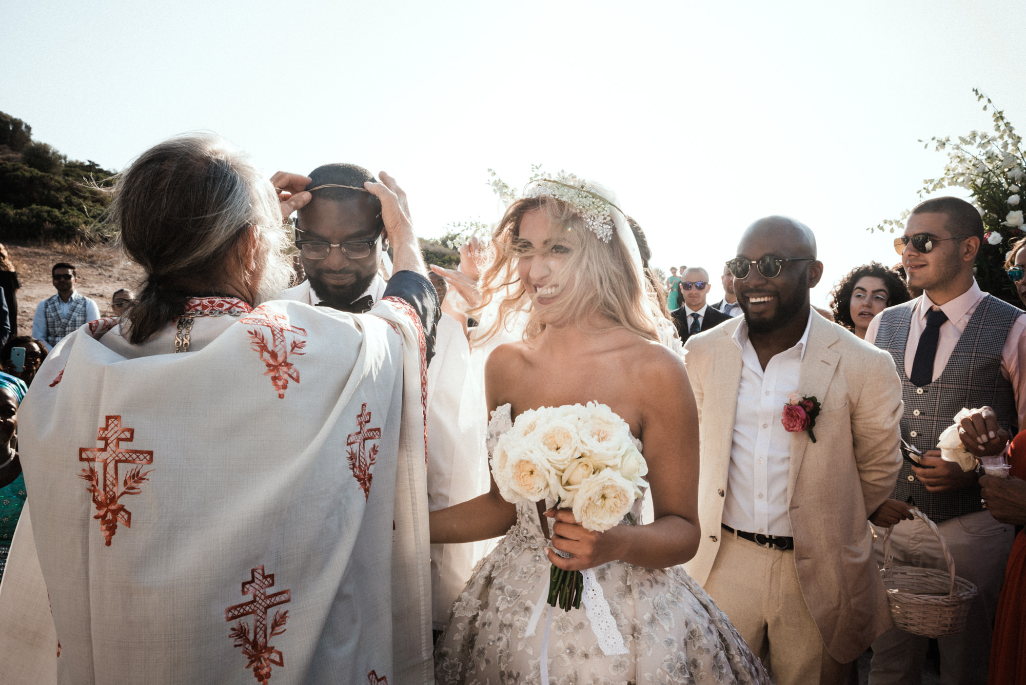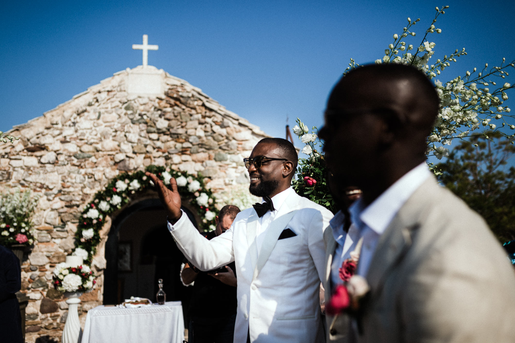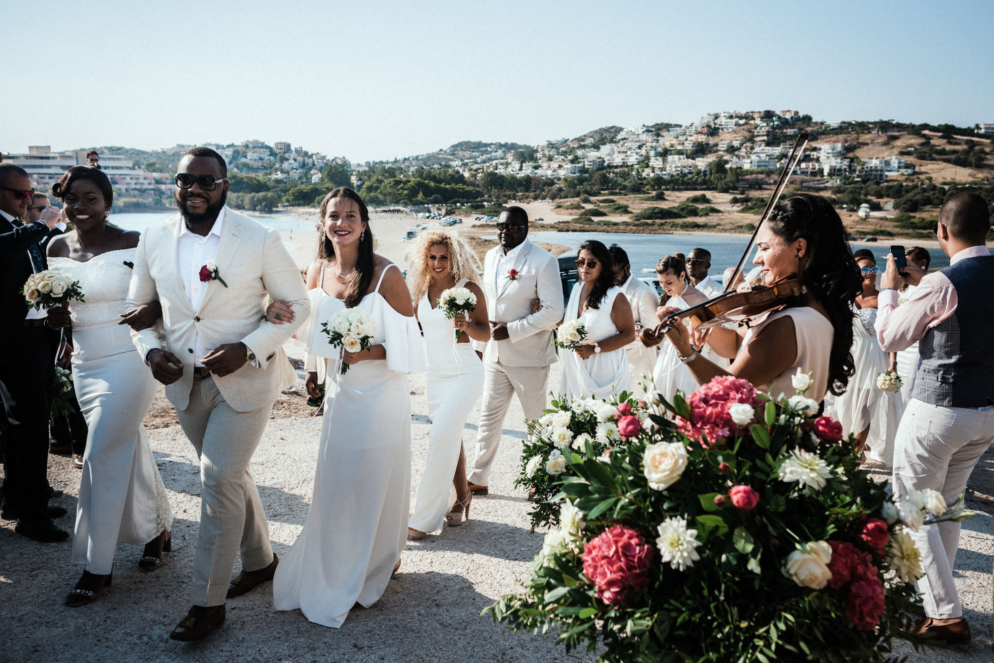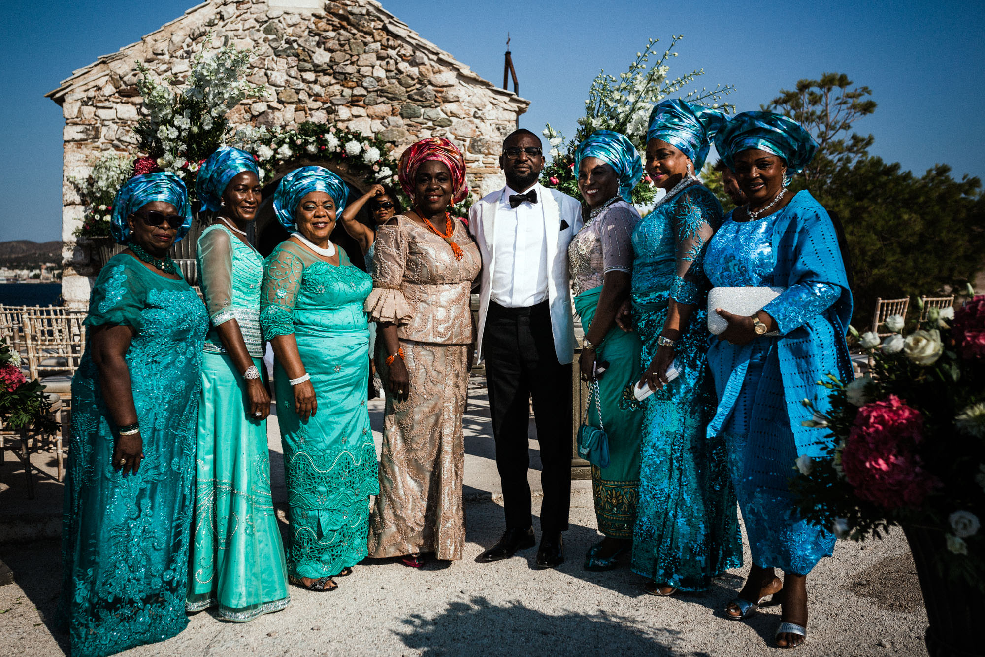 The afternoon Athenian Riviera Orthodox church service in Anavyssos, complemented perfectly the beautiful, colourful dresses of the wedding party. Just perfect. You could just feel the raw emotion, and the love in the air as soon as Hala stepped out of the car, to be escorted by her father to the small stone church where Michael, and his family and friends were waiting.
