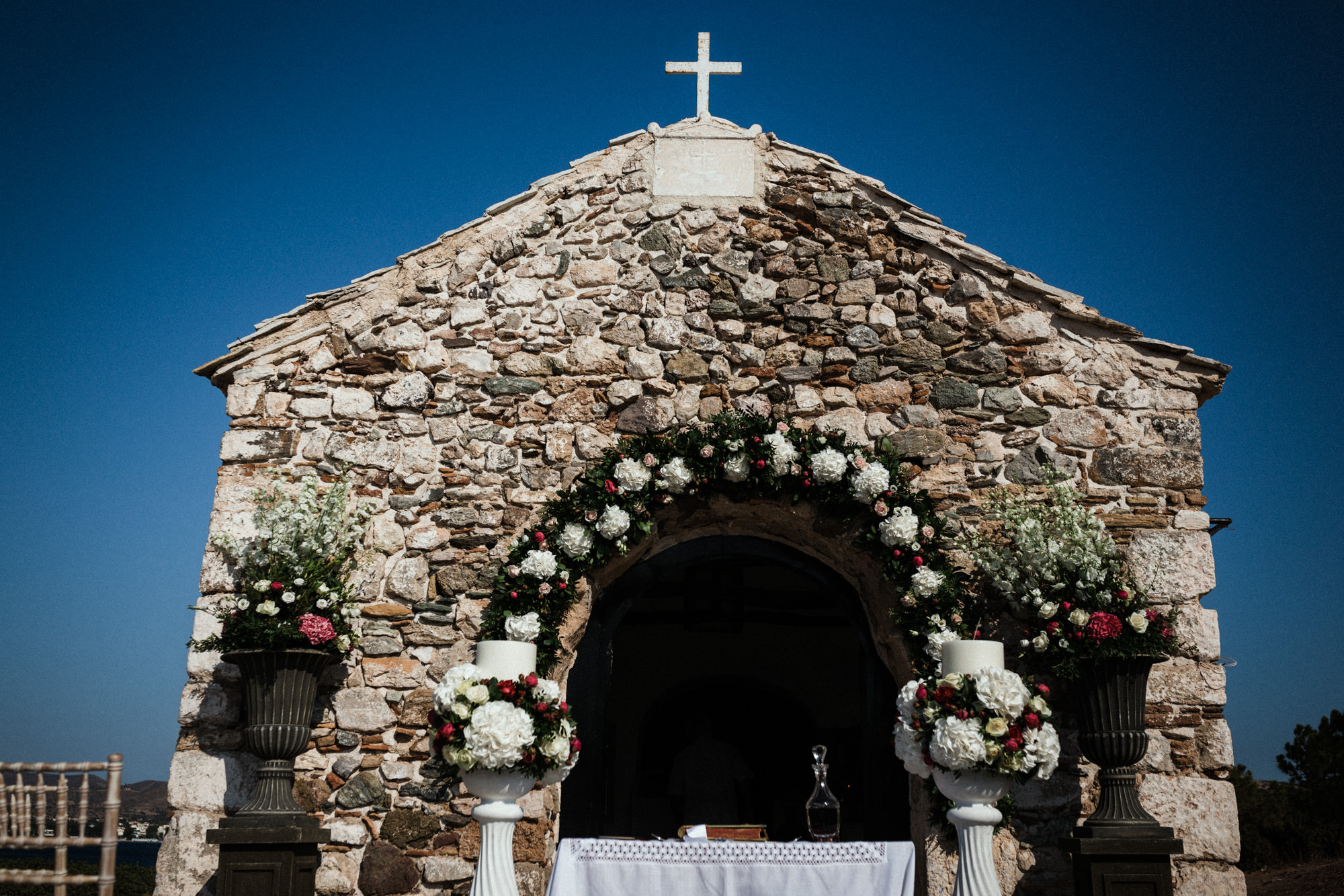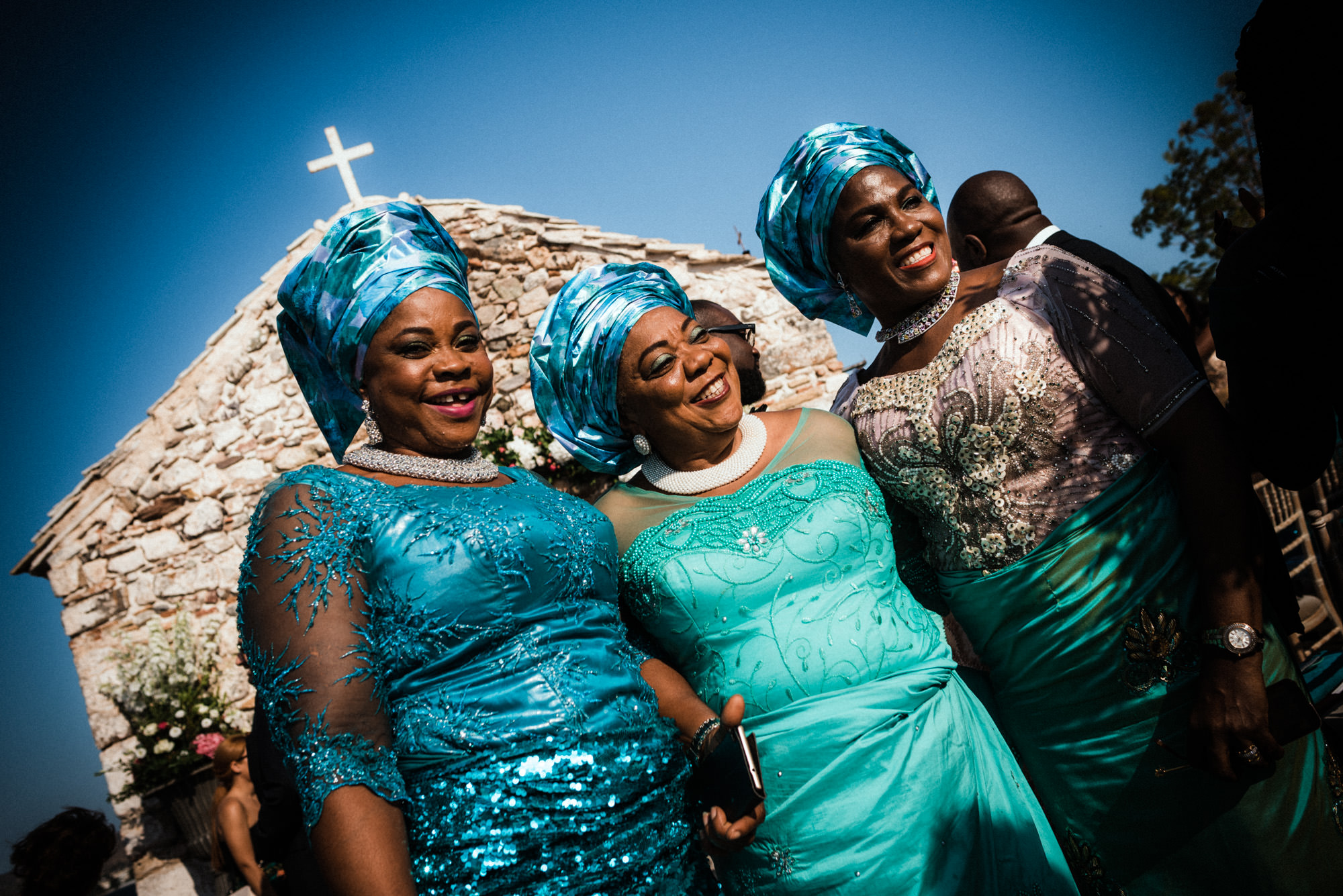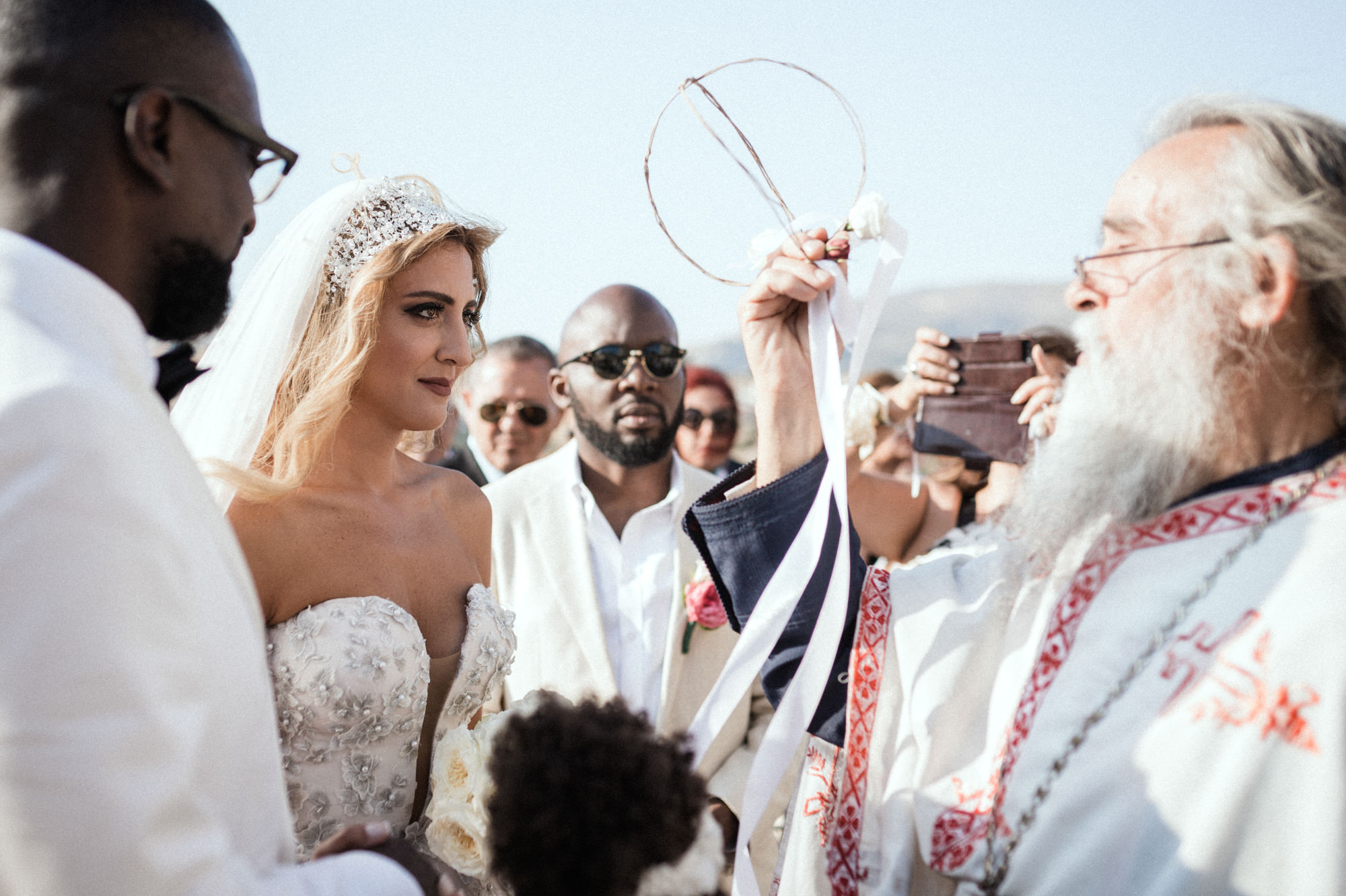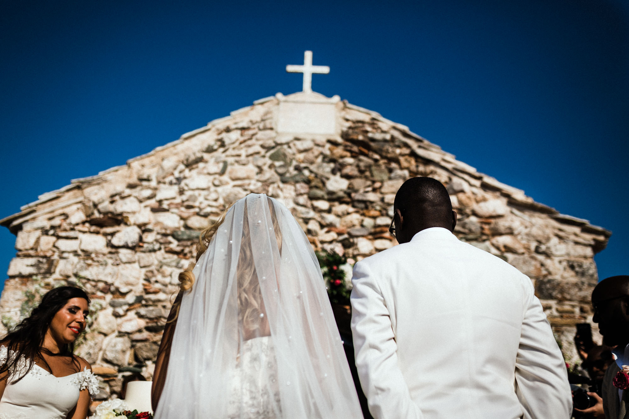 The afternoon Athenian Riviera Orthodox church service in Anavyssos, complemented perfectly the beautiful, colourful dresses of the wedding party. Just perfect. You could just feel the raw emotion, and the love in the air as soon as Hala stepped out of the car, to be escorted by her father to the small stone church where Michael, and his family and friends were waiting.