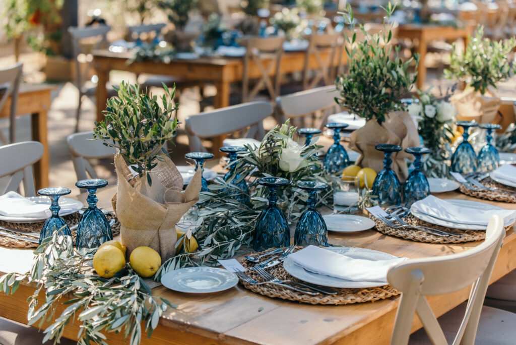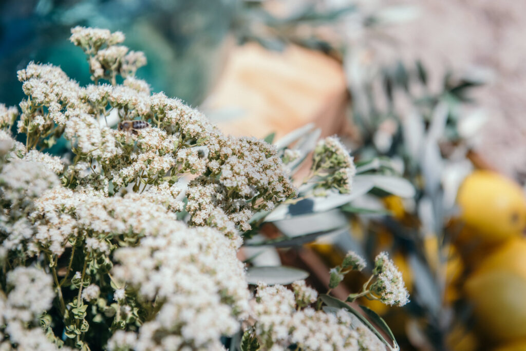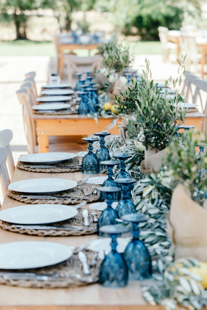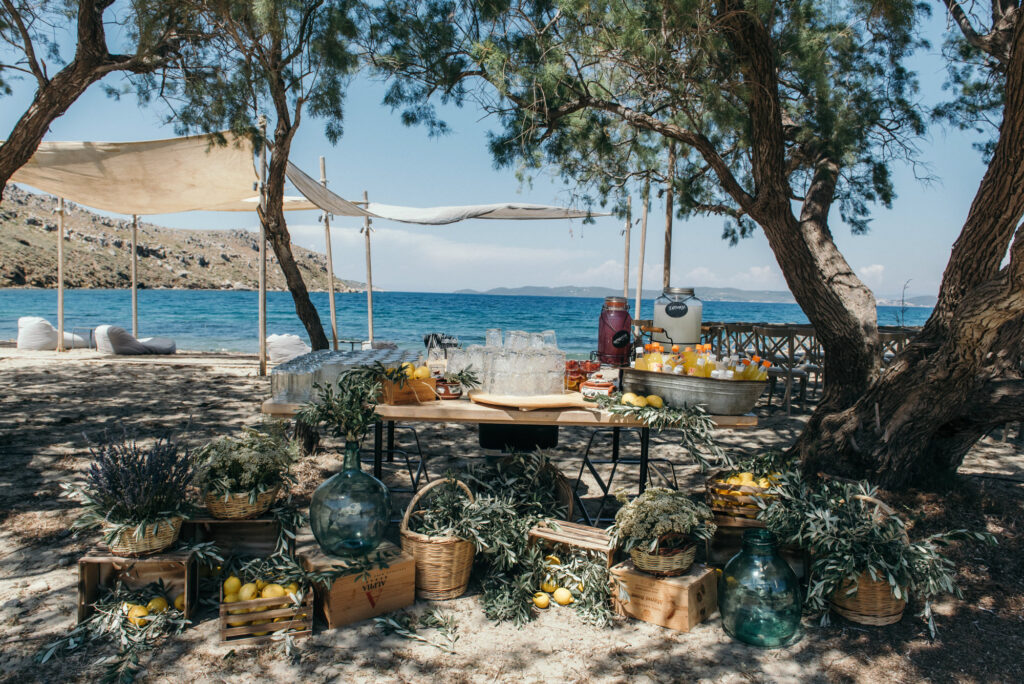 Post ceremony refreshments served from a rustic, elegant seaside buffet with glorious elements of local greenery – olives and lemons. The refreshments served by Oz Catering were as always divine and so needed under the afternoon sunset.