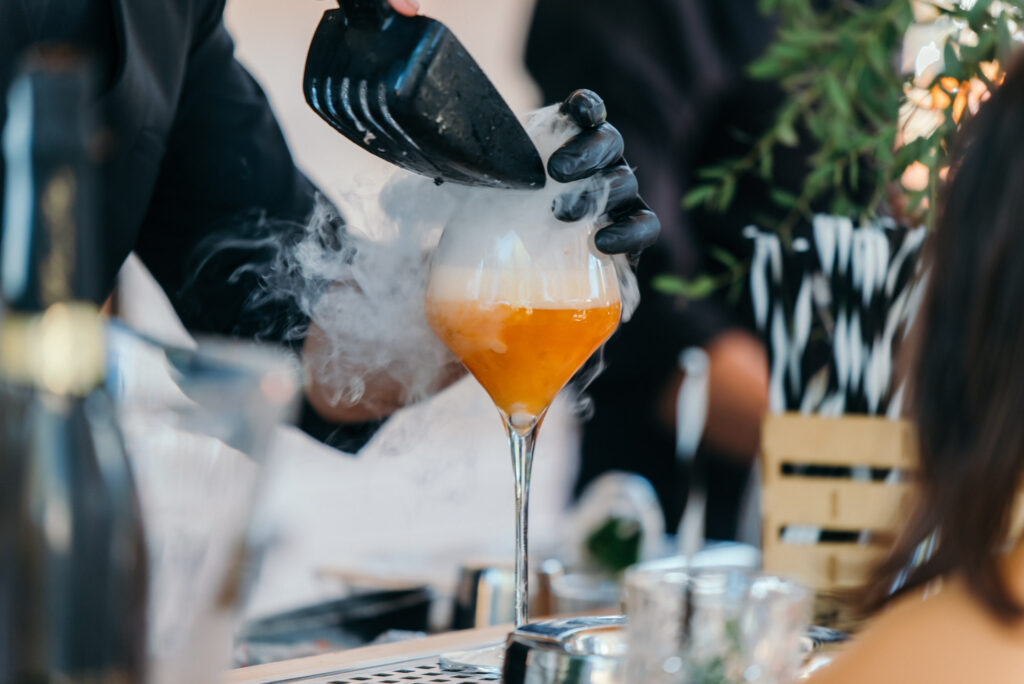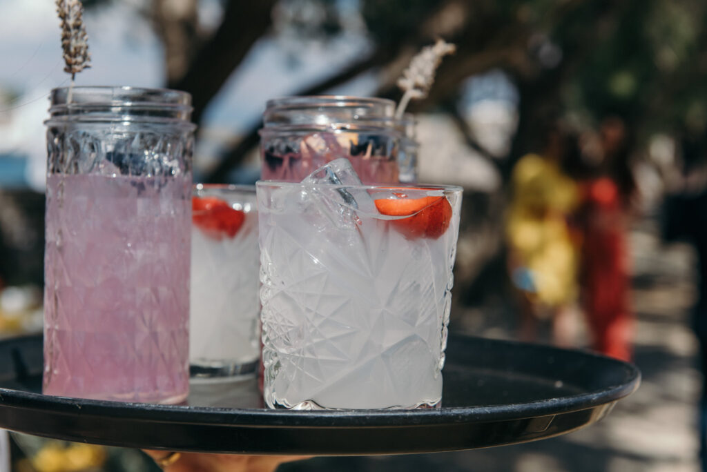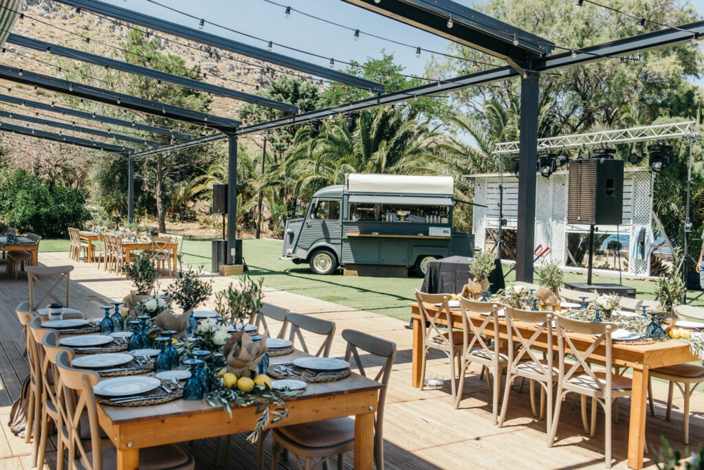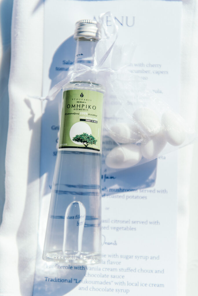 The set up for dinner and speeches was perfect with tones of Mediterranean Blue, Olive Green and famous Chios landmarks for table settings. Dinner followed in a relaxed, informal atmosphere. The Oz Cocktail Van provided the perfect French touch to the evenings shenanigans with tailormade cocktails for the couple and guests.