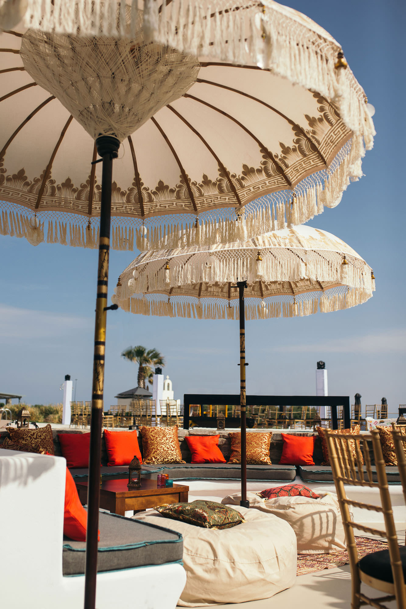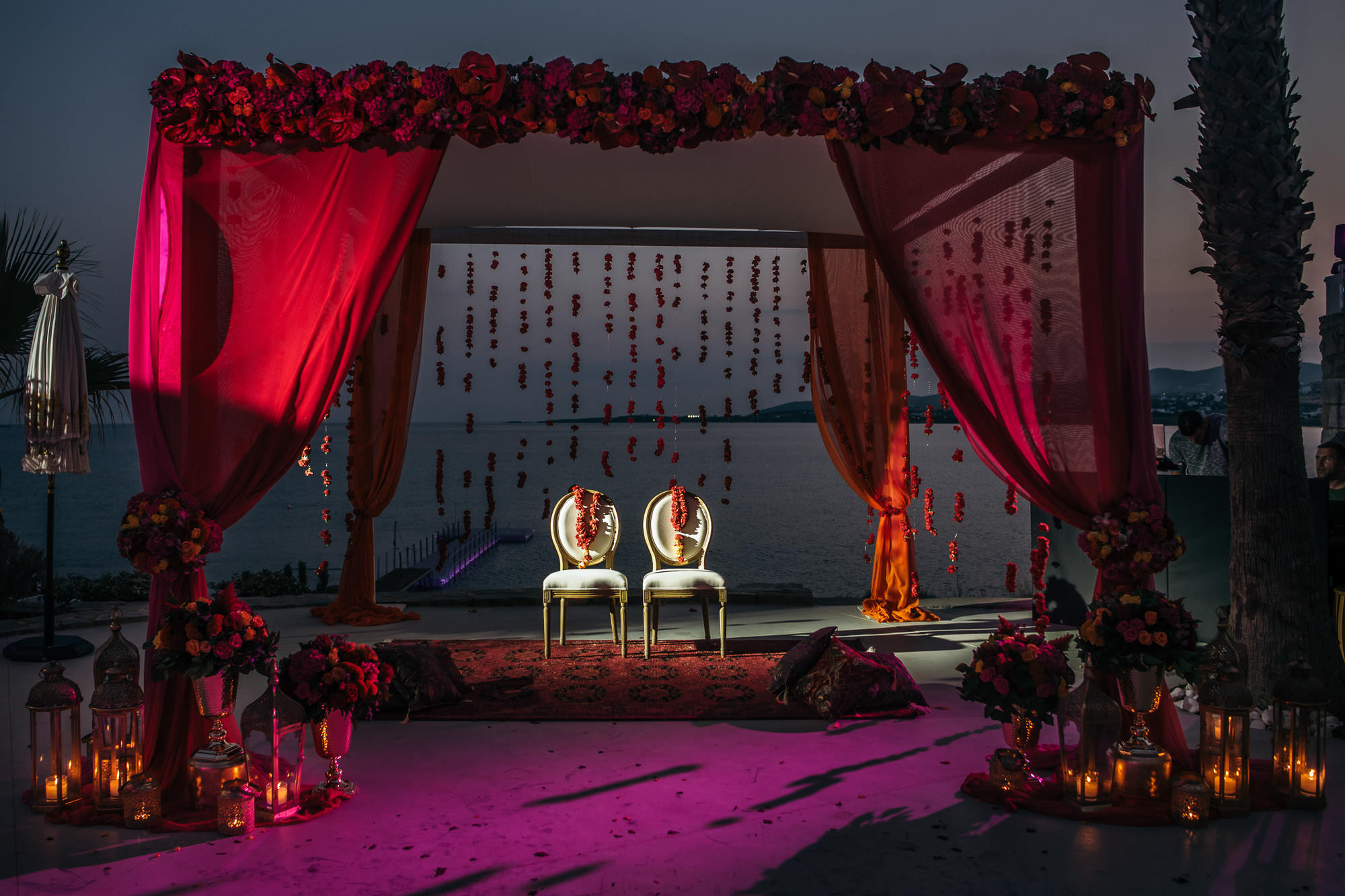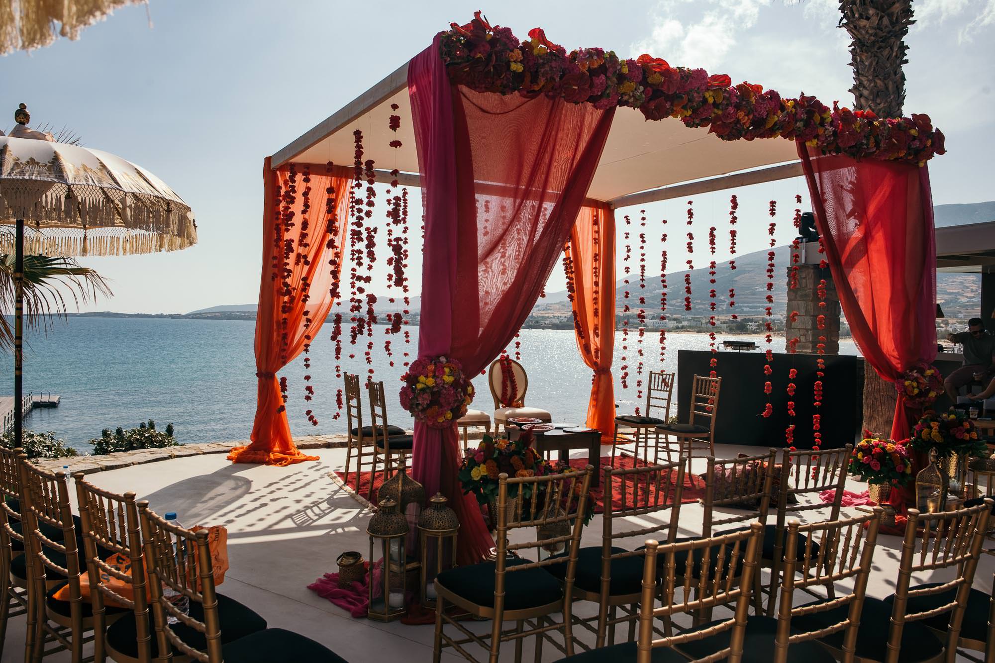 The wedding guests came from all corners of the globe, to convene for the special days – which began with an easy going welcome dinner in Siparos, an elegant seaside venue near Naoussa. The second day saw the key aspects of the Indian wedding ceremony, Sangeet and Mehndi at the Poseidon of Paros. The mandap was to die for with bright colours, contrasting perfectly with the whites and blues of the natural environment. The sounds and lights of Nikos X and his crew ensured the party lasted into the early hours.